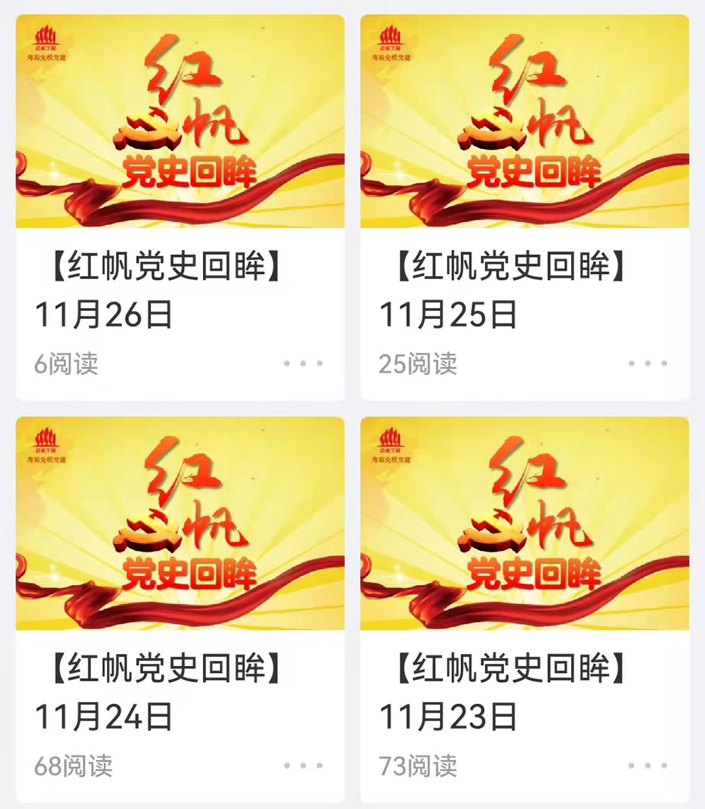 “紅帆工程”創(chuàng)建以來,始終發(fā)揮思想政治引領(lǐng)作用。在公司黨建微信公眾號先后開辟了“紅帆學(xué)習(xí)”“紅帆課堂”“紅帆講習(xí)堂”欄目,適時推送習(xí)近平新時代中國特色社會主義思想學(xué)習(xí)內(nèi)容、習(xí)近平總書記的重要講話、重要指示批示精神以及集團(tuán)公司、股份公司最新指示精神,共發(fā)送各類推文100余篇。2021年黨史學(xué)習(xí)教育期間,為進(jìn)一步引導(dǎo)公司員工學(xué)黨史、知黨情、跟黨走,在公司OA辦公系統(tǒng)、美篇上設(shè)置“紅帆黨史回眸”專欄,每日通過系統(tǒng)和微信群向黨員推送“黨史回眸”學(xué)習(xí)資料220篇。相應(yīng)欄目的開辦,進(jìn)一步強(qiáng)化了思想政治引領(lǐng)作用,激發(fā)了員工愛黨愛國的巨大熱情,凝聚了員工士氣,提升了黨建工作實效。