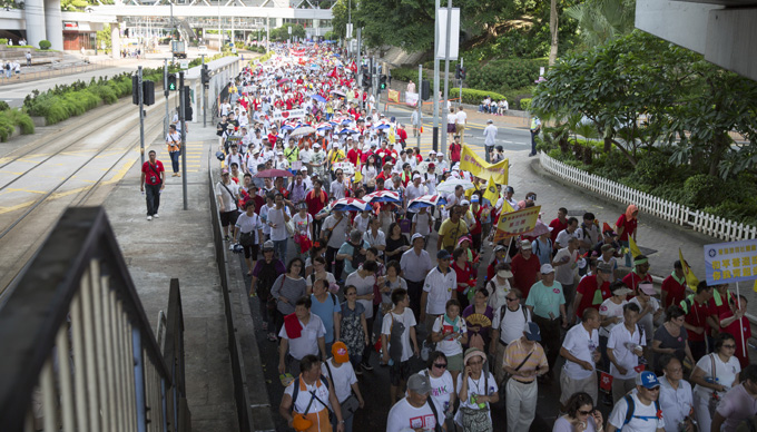 8月17日下午,在超過32度高溫的天氣情況下,集團領導和在港各部司員工及部分員工家屬800余人,積極響應香港中國企業(yè)協(xié)會的呼籲,參加了香港「保普選、反占中」大聯(lián)盟發(fā)起的「和平普選大遊行」,表達港中旅員工擁護「一國兩制」和基本法、依法實施普選的願望和訴求。張學武董事長和姜巖董事副總經(jīng)理到維園集會現(xiàn)場為大家加油鼓勁,張逢春總會計師、許慕韓副總經(jīng)理等集團領導和員工隊伍一起全程參加了遊行。