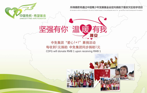 4月20日,四川雅安發(fā)生7.0級地震,突如其來的災(zāi)難牽動著無數(shù)中國人的心。地震發(fā)生后,各大企業(yè)、社會組織、各地民眾紛紛行動了起來,通過各種方式給災(zāi)區(qū)予以最大的關(guān)注和支援。作為免稅行業(yè)標(biāo)桿企業(yè),中國免稅品(集團(tuán))有限責(zé)任公司(以下簡稱中免集團(tuán))在繼汶川、玉樹地震捐助后,再次攜手中國青少年發(fā)展基金會,發(fā)起“愛心1+1”雅安救災(zāi)助學(xué)捐助倡議,向雅安地震災(zāi)區(qū)孩子們獻(xiàn)出一份愛心,幫助他們早日走出災(zāi)難陰霾,重建家園。