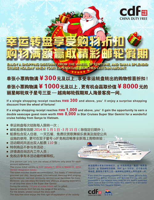 圣誕元旦臨近,旅游價(jià)格相對(duì)平穩(wěn)、上班族集中休假等因素使得今年雙節(jié)旅游市場(chǎng)再次迎來(lái)出游小高峰。其中不少公司白領(lǐng)將春節(jié)出境游計(jì)劃提前,選擇性?xún)r(jià)比更高的錯(cuò)峰出游。各大商家的年終促銷(xiāo)活動(dòng)讓節(jié)日提前升溫,2013年12月15日-2014年1月5日期間,中國(guó)免稅品(集團(tuán))有限責(zé)任公司(以下簡(jiǎn)稱(chēng)中免集團(tuán))旗下十家免稅店聯(lián)合推出“幸運(yùn)轉(zhuǎn)出來(lái)&幸運(yùn)秀出來(lái)”年終主題促銷(xiāo)活動(dòng),貼心的購(gòu)物折扣以及價(jià)值約百萬(wàn)元的麗星郵輪船票大獎(jiǎng),為雙節(jié)出境游客送上別樣驚喜。