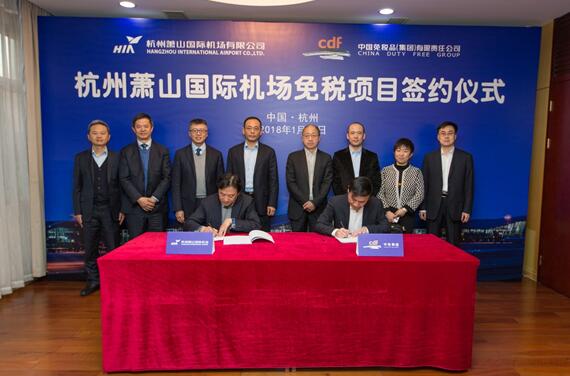 2018年1月11日,杭州蕭山國際機場免稅項目簽約儀式在機場綜合辦公樓舉行。中國免稅品(集團)有限責任公司董事長陳建山、副總經(jīng)理王軒,杭州蕭山國際機場有限公司董事長王敏、總經(jīng)理鄭向平以及相關人員出席了簽約儀式。