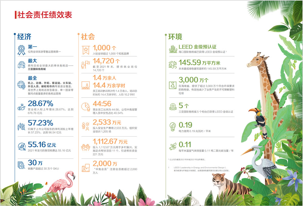 7月18日,中國旅游集團中免股份有限公司以中英文雙語的形式,披露了公司上市以來的首份ESG報告——《2021年度環(huán)境、社會及管治報告》。公司以不斷滿足消費者日益增長的對美好生活的追求為使命,在推動公司高質量發(fā)展的同時,積極以行業(yè)道德行為和成果貢獻回饋社會,成績斐然。