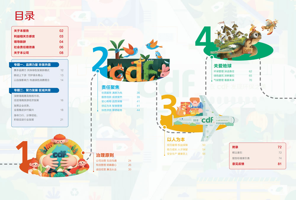 值得注意的是,本次ESG報告封面和部分內頁插圖選自“在cdf發(fā)現環(huán)保之美”環(huán)保公益海報設計大賽獲獎作品,希望通過異彩紛呈的審美創(chuàng)意、元素碰撞,進一步傳遞綠色發(fā)展的美好愿望。