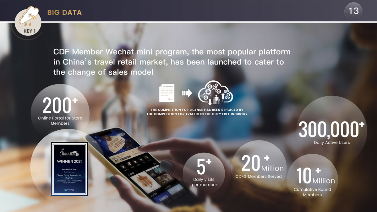 陳國強表示,"我們推出了基于會員的線上平臺cdf會員購,此外還積極迎合銷售模式的變化,推出了基于中免2000多萬會員的會員小程序,在流量為王的時代建立了中國旅游零售市場最大的流量平臺。"他介紹稱,"通過兩年多的運營,該會員小程序日活躍用戶達30多萬,成為中免甚至是中國旅游零售重要的流量平臺,未來機場口岸的客流恢復(fù)后還將成為打通中免線上線下的重要流量入口。"這一舉措也得到了業(yè)內(nèi)的高度認可,榮獲穆迪2021年度最佳數(shù)字團隊獎。