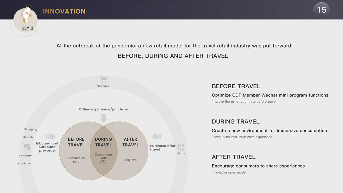 在創(chuàng)新發(fā)展方面,中免集團主要開展了三大方面的探索,包括完善了基于行前、行中、行后的旅游新零售模式,針對中國最有消費能力客群推出超級VIP服務(wù),以及將充滿科技感和體驗感的元素融入線上線下消費場景。